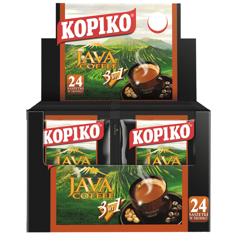 Rozpuszczalny napój kawowy Kopiko Java Coffee 3in1 o smaku kawy z mlekiem i cukrem. Doskonały smak i aromat zawdzięcza swojemu egzotycznemu pochodzeniu